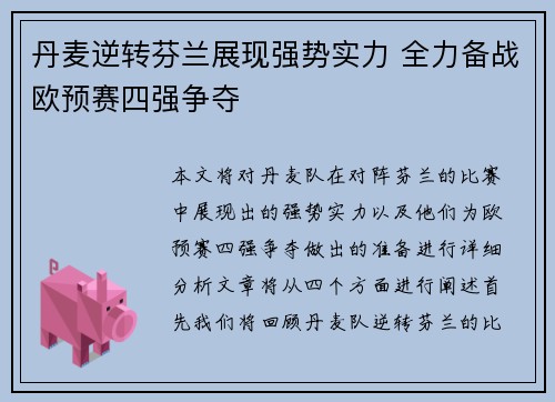 本文将对丹麦队在对阵芬兰的比赛中展现出的强势实力以及他们为欧预赛四强争夺做出的准备进行详细分析。文章将从四个方面进行阐述:首先,我们将回顾丹麦队逆转芬兰的比赛细节,分析他们如何在逆境中展现出不屈不挠的精神。其次,丹麦队的战术执行力和球员的个人能力也是胜利的重要因素。接着,丹麦队在球队整体实力上的提升以及教练团队的战略部署也为他们的胜利奠定了基础。最后,本文将探讨丹麦队为备战欧预赛四强争夺所做的全方位准备,展现他们在未来赛季中争取更好成绩的决心和行动。本文旨在深入剖析丹麦队的强大实力及其为未来赛事的筹备,期望为广大足球爱好者提供有价值的分析与见解。